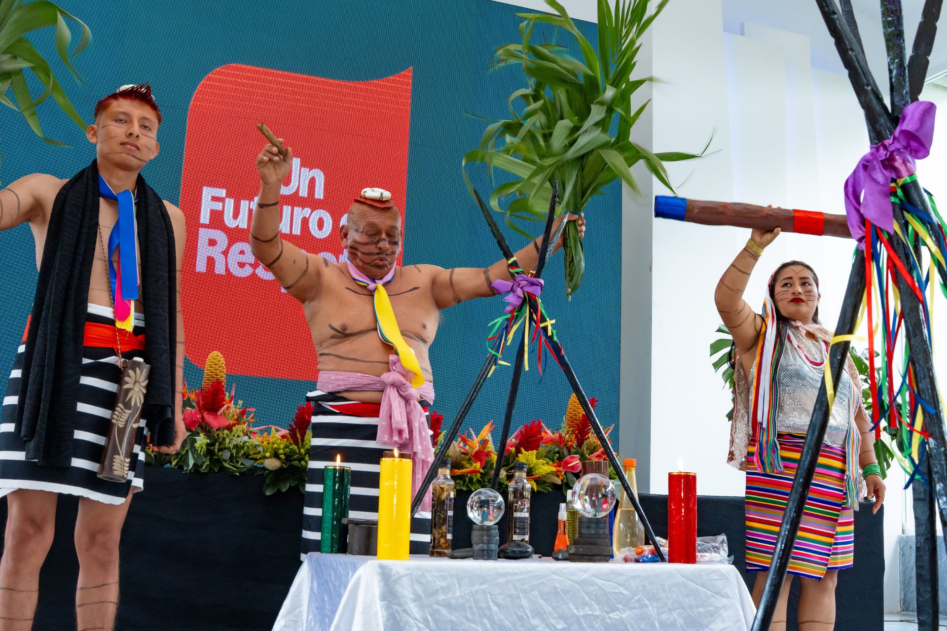 Además, vivimos un momento profundamente simbólico junto a representantes de la Comuna Peripa, una comunidad de la nacionalidad indígena Tsa’chila, que tiene gran relevancia para nuestra historia. En un acto de conexión con la naturaleza y la ancestralidad, donde miembros del pueblo y su “Pone Tsa’chila”(sabio local con conocimientos ancestrales) condujeron un ritual en homenaje a los cuatro elementos esenciales que sostienen la vida: fuego, agua, aire y tierra.